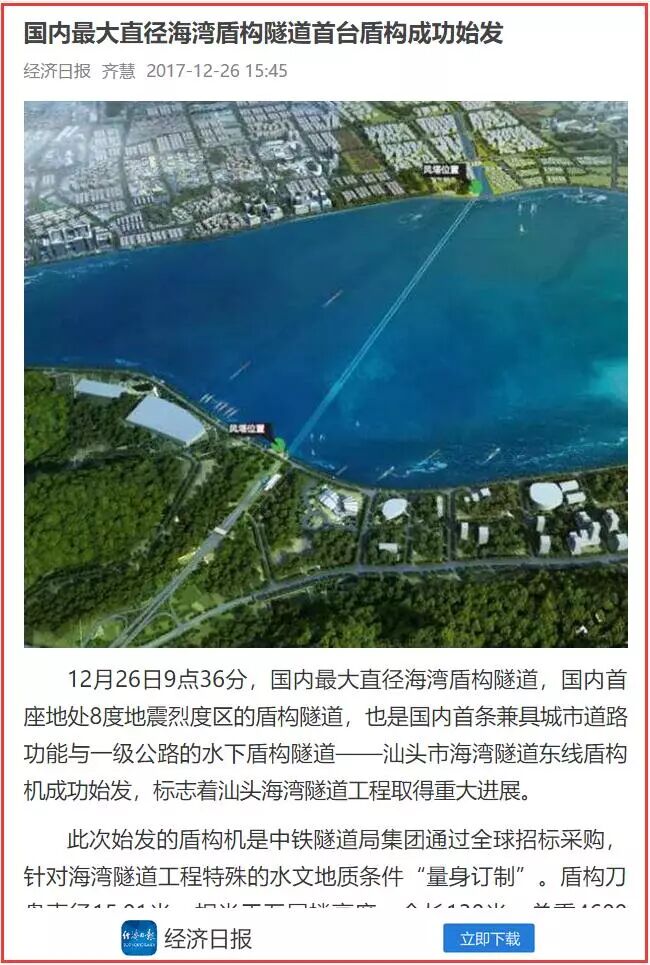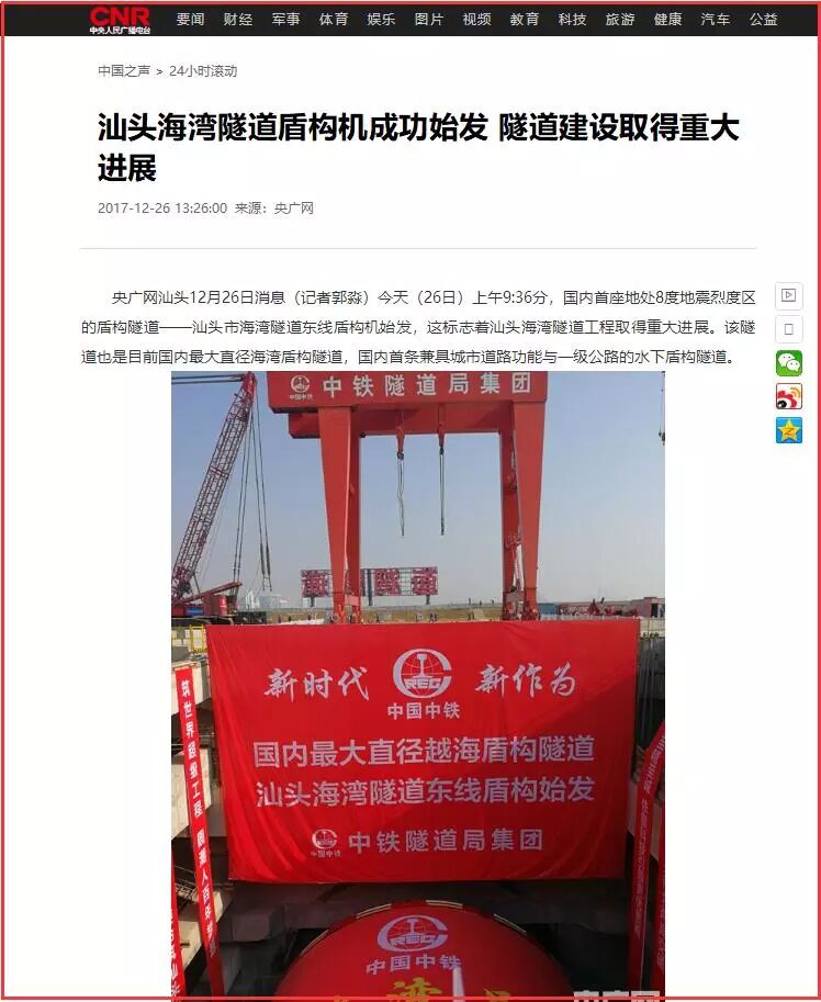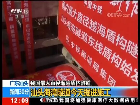 12月26日,中国中铁隧道局承建的汕头市海湾隧道东线盾构机成功始发,标志着汕头海湾隧道工程取得重大进展。中央电视台现场采访,并进行网络直播,新华社、中央人民广播电台、《经济日报》等中央主流媒体及地方媒体聚焦报道。