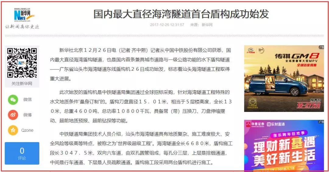 12月26日9点36分,国内最大直径海湾盾构隧道,国内首座地处8度地震烈度区的盾构隧道,也是国内首条兼具城市道路功能与一级公路的水下盾构隧道——汕头市海湾隧道东线盾构机成功始发,标志着汕头海湾隧道工程取得重大进展。