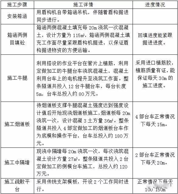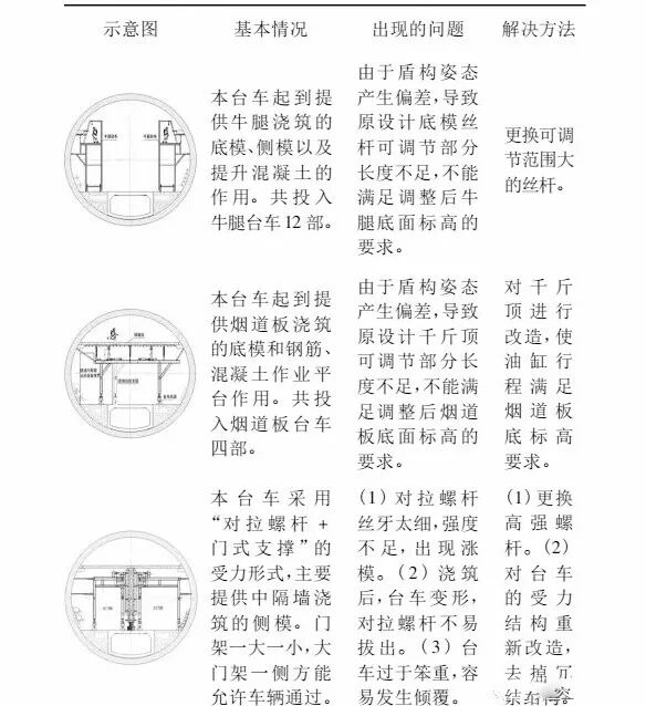 洞通后,烟道板、中隔墙成为制约工期的关键。经过统筹安排,决定采用定型制作的模板台车、在洞内分流水施工,达到快速施工的目的。现场台车示意图及使用情况见表2。