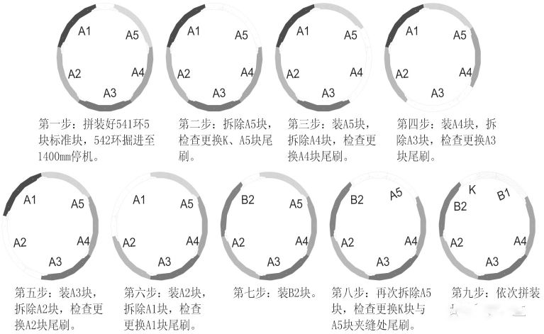 首先拆除最后一环管片A5块,对区域(K、A5)外露盾尾刷检查更换,完成后,立即恢复A5块的安装。 新安装的A5块点位应错开原安装位置1个点位,然后再拆除标准块A4,更换A4块区域盾尾刷,依次按照顺序逐块拆除,逐块更换该区域盾尾刷,并逐块恢复拼装。