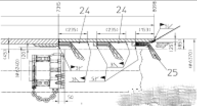 由于密封刷位于管片背部,拆除管片时需要根据被更换密封刷的位置控制好管片的位置,不可拆除盾尾尾部最后二道密封刷下部的管片。本区间盾构机为海瑞克S641盾构机,其行程油缸千斤顶达到最大行程2200mm时,撑靴与加强环及盾尾刷的关系如图3所示。同时考虑中盾与盾尾的铰接油缸行程差,可以计算出,541环临时管片拼装完成后,选择542环掘进油缸行程为1400mm时,盾构机进行停机。
