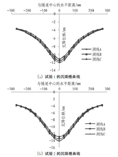 当试验过程中模型试验1 和模型试验2 的地层损失率分别为1. 98% 和3. 32% 时,其测线A、测线B 和测线C 的沉降槽曲线如图2 所示。