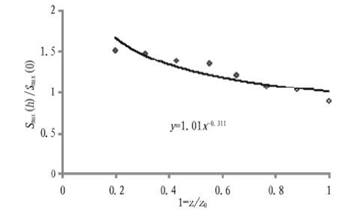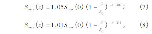 对模型试验1 及模型试验2 数据进行拟合,可得到关于Smax( z) /Smax( 0) 与( 1 - z /z0) 函数关系曲线,其函数曲线如图3 和图4 所示。