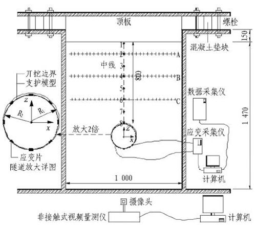 为了预测圆形隧道施工引起不同深度地层沉降位移关系,进行圆形隧道开挖引起不同深度地层沉降的平面应变模型试验,如图1 所示。模型试验主要包含以下3 方面内容: 1) 试验台架; 2) 地层材料模型、隧道开挖边界模型及隧道支护模型; 3) 量测装置,包含隧道支护内力量测及不同深度地层沉降位移量测。
