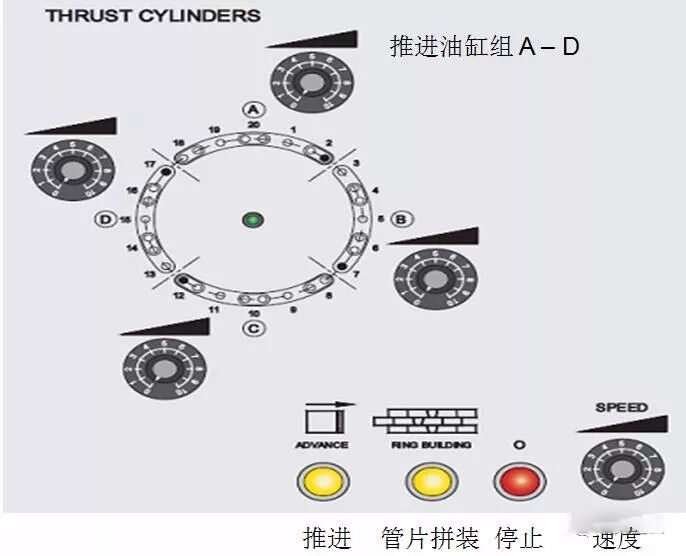 盾构机掘进部分主要含有这8个参数,它们在中控室显示的F1界面上显示,主要集中在F1界面的左半部分(如图1);通过推进油缸控制面板(如图2)进行控制。