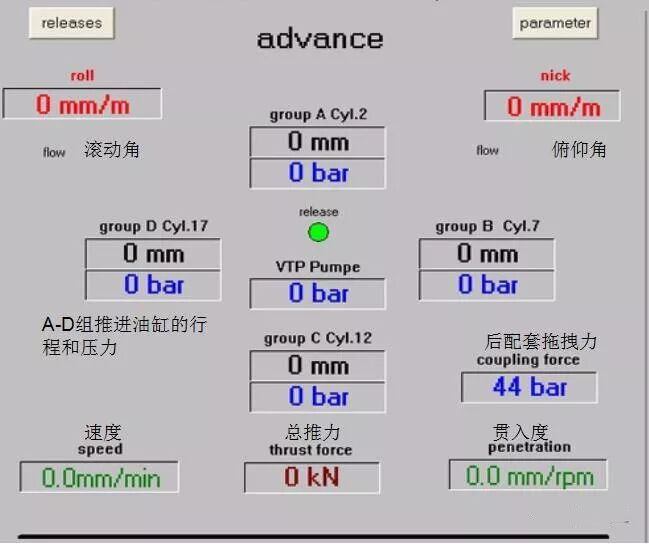 意义:推进油缸的行程又叫伸长量,指油缸伸出的长度,和油缸压力一样分四组进行显示,单位[mm] 。