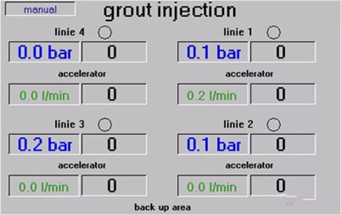 注浆的参数在F1界面的右部(如图12)有显示,通过注浆控制面板(如图13)进行控制。