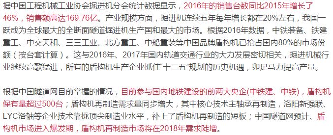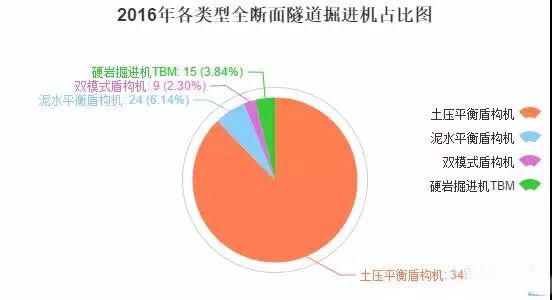从2016年生产销售的盾构机的类型来看,复合式土压平衡盾构机占大多数,一方面说明国内的地质情况复杂多变,除了软弱地层之外,大多数是盾构机是在复合地层中掘进,另一方面在相当一部分软弱地层中,有很多情况下是土压平衡盾构机和泥水平衡盾构机均可以适应的,若非对掘进有特别要求,选用土压平衡盾构机可以提高工效,降低施工成本。值得注意的是,TBM的市场额份额有所提高,TBM不光在山岭隧道施工,也进入了城市地铁行业。