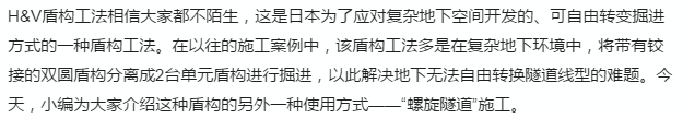 H&V盾构工法相信大家都不陌生,这是日本为了应对复杂地下空间开发的、可自由转变掘进方式的一种盾构工法。在以往的施工案例中,该盾构工法多是在复杂地下环境中,将带有铰接的双圆盾构分离成2台单元盾构进行掘进,以此解决地下无法自由转换隧道线型的难题。今天,小编为大家介绍这种盾构的另外一种使用方式——“螺旋隧道”施工。