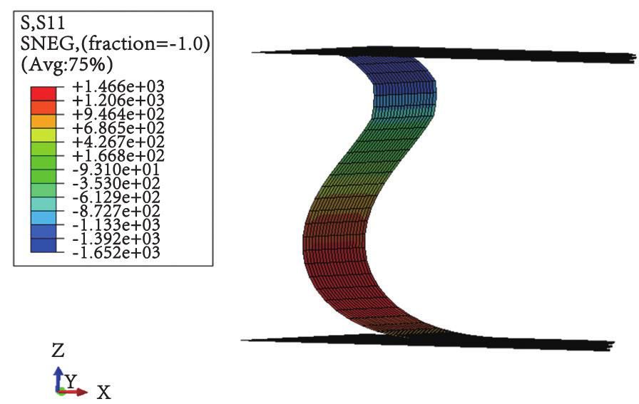 如图 4 所示,前板固定端局部应力已经达到1652MPa,从材料本构上来说早已进入塑性,变形呈现流动状态,构件早已破坏。由计算结果可以看出,在 0.5MPa 的压力下,盾尾刷在盾尾管片正常间隙 110mm 时,前板很有可能发生断裂。