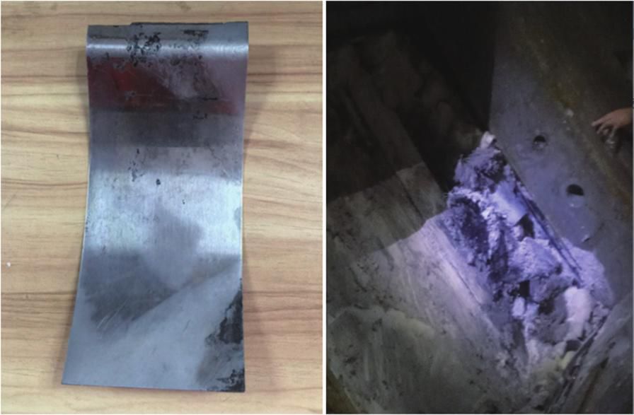 右线盾构推进至 183 环时,同步砂浆从盾尾下部涌出,渗漏量约 6m 3 ,此时切口为全断面④ 2 粉细砂,大量补压盾尾油脂,同时减少漏浆位置的砂浆注入量,推进完成后拼装时开始在管片外弧面整环填塞海绵,未再出现漏浆情况。清理盾尾时发现有盾尾刷前侧弹簧钢板被带出,钢板发生弯曲变形,如图 2 所示,此情况可判断盾尾刷已经发生损伤,盾尾密封存在与外界连通的渗漏通道,故在 221 环检查渗漏位置的最内道盾尾刷:不拼装封顶块继续推进,直接推至最内一道盾尾刷暴露,发现盾尾刷前侧弹簧钢板全部缺失,钢丝刷出现翻折现象,如图 3 所示。