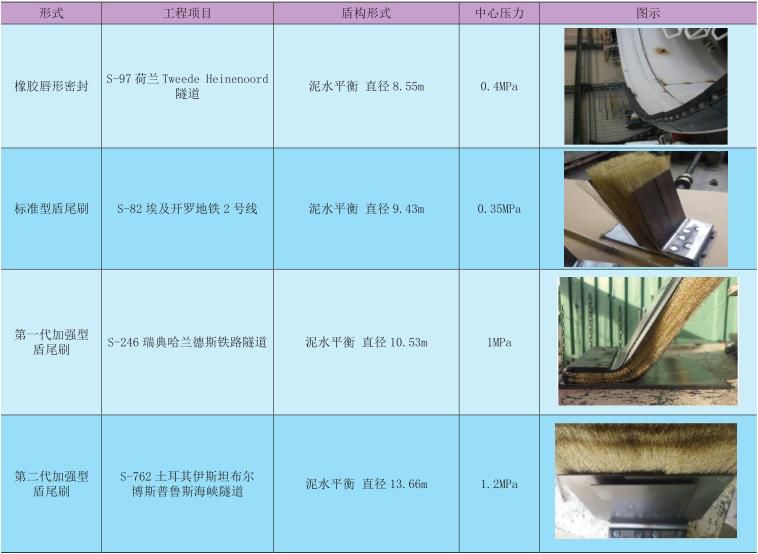 盾尾密封最早为橡胶唇形密封,在工程实践中逐渐发展为如今广泛使用的标准型盾尾刷,前板为平行弹簧钢板,后板为交错的弹簧钢板。瑞典哈兰德斯铁路隧道项目为承受大于 1MPa 的水土压力,产生第一代加强型盾尾刷,前板改进为交错的弹簧钢板。2014 年土耳其伊斯坦布尔博斯普鲁斯海峡隧道在最深点发生了盾尾渗漏,对盾尾刷进一步改进,产生第二代加强型盾尾刷,前板改为两层交错的弹簧钢板再外覆一道弹簧钢板。盾尾密封装置发展过程如表 1 所示。