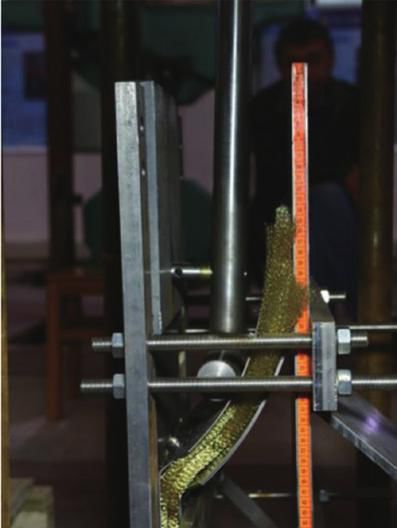 为研究盾尾刷发生破坏的具体原因,针对单个尾刷进行了模拟破坏实验,实验装置选用 YES-100数显管刚度压力试验机,为模拟实际施工工况,设计了一个反力架,由 2 块厚 1cm 钢板组成,分别模拟盾尾钢结构及管片约束,尾刷根部通过螺杆及压板固定在一块钢板上,约束 3 个方向的位移,另一块钢板接触尾刷钢丝,限制其垂直于钢板面的位移,通过调整 2 块钢板的间距模拟盾尾钢结构与管片之间的间隙,加压装置为圆柱刚体,模拟油脂腔油脂压力,将面荷载简化成线荷载,如图 5 所示[4] 。