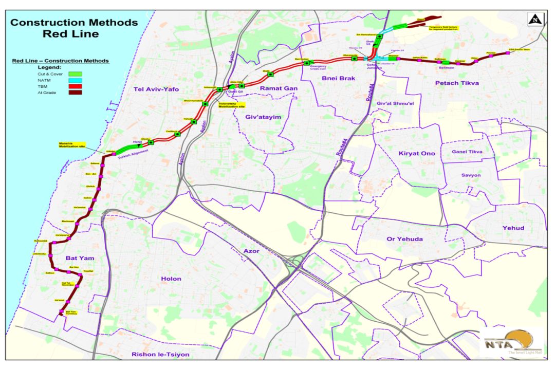 红线轻轨全长24公里,其中地下段11公里,沿线通过Bat Yam、Tel Aviv - Jaffa、Ramat Gan、Bnei Brak和Petach Tikva等五个城市,共设24座地面车站和10座地下车站,地面站间距500米,地下站间距1公里左右。