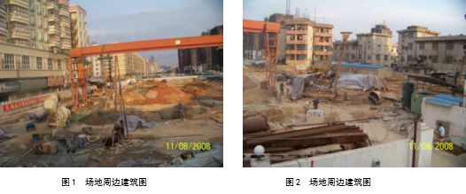 深圳市某地铁工程标段位于深圳宝安区,由两个车站和两个区间段共计四个单位工程组成,全长2479.1m,是深圳地铁系统的重要组成部分,该标段车站采用明挖顺筑法施工,区间段采用盾构法施工。其中,暗挖区间隧道工程位于深圳市宝安区一主干路下11m~12m,所在地区为海积平原,地形平坦。隧道上方场地内管线已改迁完毕,但场地内仍存有废弃雨水、污水、路灯等地下管线管道,两侧主要建筑物为90年代初修建的3~5层零星建筑物。周边建筑情况如图1及图2所示。