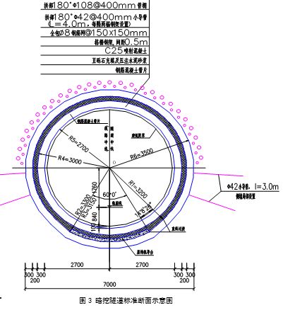 矿山法施工范围内,洞身开挖施工采用上下台阶法两部开挖,同时,采取环向间距为300mm双排小导管超前注浆,小导管每隔一榀施作一环。初期支护采用钢筋网片、格栅钢架(间距0.5m)、C25喷射混凝土(30cm厚)做为底衬,与水平工字钢横撑组成联合支护体系。暗挖隧道与盾构区间过渡段10m范围由素混凝土回填进行全断面加固,保证盾构通过穿越过程中的安全,二次衬砌由盾构机空推拼装管片。暗挖隧道[2]标准断面如图3所示。止水方案采用钢板桩止水帷幕,钢板桩距隧道开挖轮廓线外2.5m以外,钢板桩伸至岩石面,实施止水帷幕内管井降水。施工过程中和施工完成后的土体变形监测未发现异常。