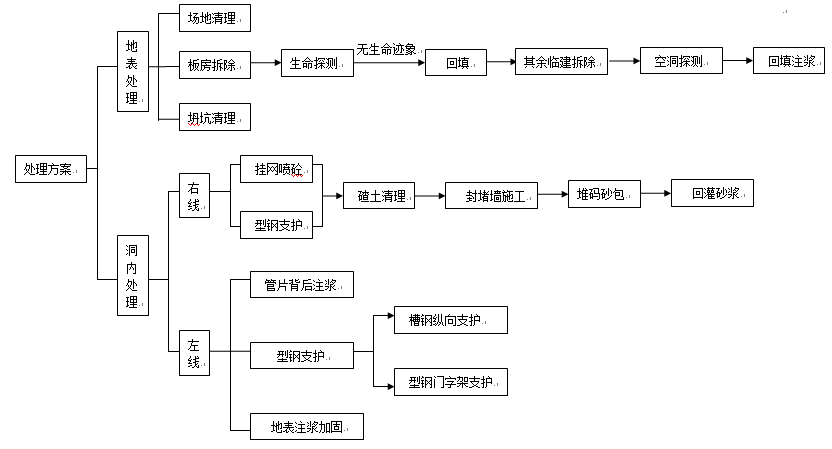对右线隧道内进行碴土清理及抽排水,在保证安全的前提下进行对左、右线隧道内(坍塌影响范围),采取型钢纵向加固及横向支护加固,同时加强对周边建筑、管线及左线隧道的监测频率;
