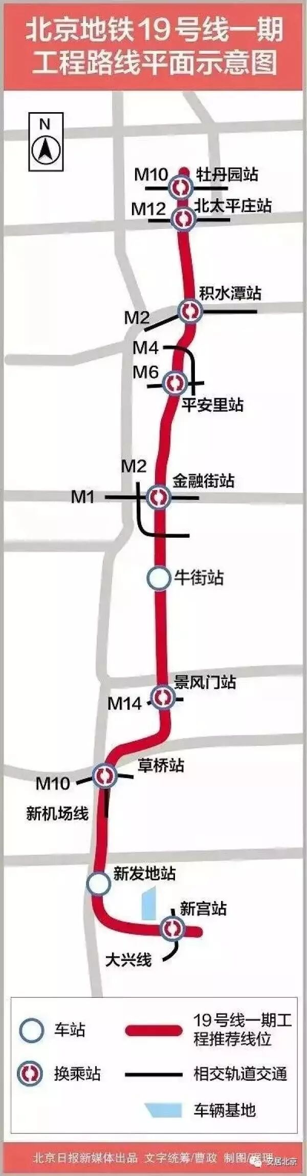19号线经过南苑边缘组团、金融街、中关村科技园等重点功能区域,跨越丰台、西城、海淀三大城区,是一条纵贯南北的轨道交通骨干线路,也是中心城西部地区的加密线。建成后可缓解金融街地区的交通压力,同时可在草桥站与新机场线同步换乘,是服务于京津冀协同发展战略的重要配套基础设施。该线路采用8辆A型车编组,设计最高速度为100公里/小时,平均站间距2.3公里,与在建的3号线、12号线、16号线、17号线、平谷线等共同构成北京轨道交通大运量线网。