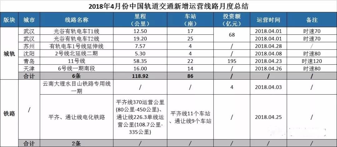 2018年4月份,中国轨道交通新增运营方面城轨版块共有武汉光谷有轨电车T1线和光谷有轨电车T2线、苏州有轨电车1号线延伸线、沈阳2号线北延线二期、青岛11号线、天津6号线一期南段6条线路开通运营,合计里程118.92公里,车站86座;铁路版块有云南大理水目山铁路专用线一期、平齐、通让线电化铁路2条线路开通运营。详细信息如下表所示。