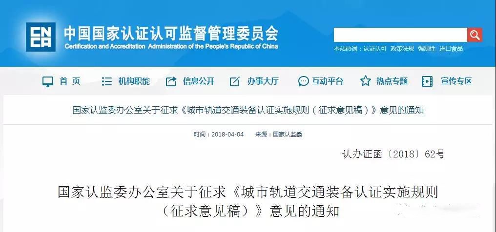 2018年4月4日,国家认监委发布《城市轨道交通装备认证实施规则(征求意见稿)》。内容包括:城市轨道交通装备认证实施规则 通用要求(征求意见稿);城市轨道交通装备认证实施规则 特定要求 车辆(征求意见稿);城市轨道交通装备认证实施规则 特定要求 制动系统(征求意见稿);城市轨道交通装备认证实施规则 特定要求 牵引传动系统(征求意见稿);城市轨道交通装备认证实施规则 特定要求 电动客车列车控制与诊断系统(征求意见稿);城市轨道交通装备认证实施规则 特定要求 车辆车门(征求意见稿);城市轨道交通装备认证实施规则 特定要求 车辆车钩缓冲装置(征求意见稿);城市轨道交通装备认证实施规则 特定要求 基于通信的列车运行控制系统(CBTC)(征求意见稿)。