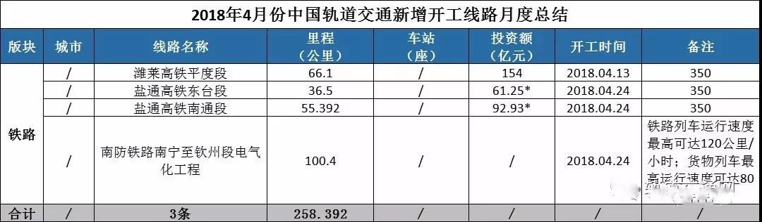 2018年4月份,中国轨道交通新增开工方面铁路版块共有潍莱高铁平度段、盐通高铁东台段和南通段、南防铁路南宁至钦州段电气化工程3条线路新增开工,合计里程258.392公里;城轨版块无新增开工线路。详细信息如下表所示。
