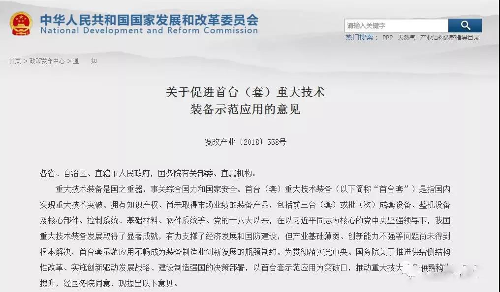 2018年4月11日,发改委发布《关于促进首台(套)重大技术装备示范应用的意见》。《意见》包括完善重大技术装备研发创新体系;健全首台套检测评定体系;构建首台套示范应用体系;推动军民两用技术和装备融合发展;加强首台套知识产权运用和保护;加大资金支持力度;强化税收政策导向;优化金融支持和服务;增强保险“稳定器”作用;发挥国有企业作用;明确法律规定要求;建立实施保障机制。