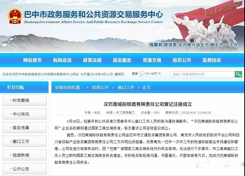 4月初,经巴中市政务服务和公共资源交易服务中心窗口工作人员积极沟通协调服务,“汉巴南城际铁路有限责任公司”企业名称顺利通过国家工商总局核准,标志着该公司征收登记成立。 据悉,汉巴南城际铁路有限责任公司由巴中市交通投资集团有限公司、南充市人民政府的投资平台公司和四川省铁路产业投资集团有限责任公司三方共同出资组建,负责南充—巴中—汉中三市的快速铁路客运专线建设和管理。