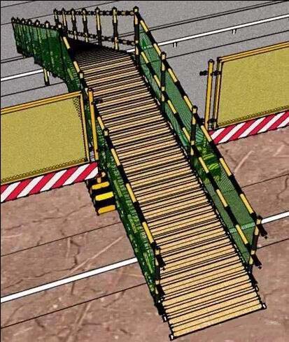 4、爬梯两侧应设置高度不小于1200mm 的钢管扶手栏杆,钢管刷黄黑相间油漆,两侧设置密目网,立杆间距1500mm。
