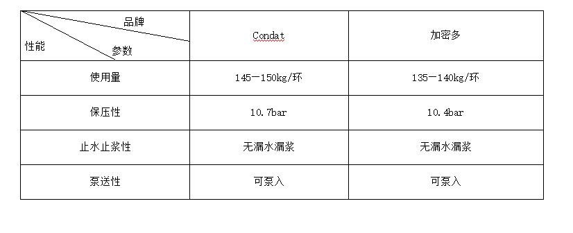 采用单洞双线盾构法施工,隧道外径11.2m,长3600m;使用海瑞克S668盾构机,直径11.64m,环宽2m,盾构穿越地层主要为②-4d2~1粉砂及细沙,该区间为过江段,最深处水深25.50m,具有较大的水压,②-4d2~1粉砂及细沙,地下水丰富,渗透性好,对注浆、止水要求高。在本标段使用了北京汉德鼎森科贸有限公司提供的加密多盾尾密封脂,在掘进速度:42mm/min,刀盘转速:1.0rpm,气泡仓压力:3.83bar,切口水压:3.01bar,泥浆泵进口压力:5.9bar,出口压力8.7bar,同步注浆压力:7.5bar的同等条件下比较得出: